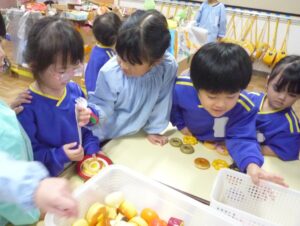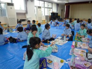 遠足では年長と年中の子どもたちが一緒にお弁当を食べる予定でした。今日は遊戯室で一緒に食べました。