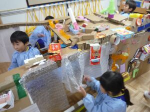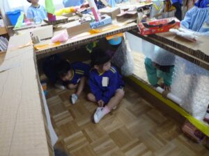 今日の遠足は雨のために延期になりました。年長の子どもたちはがっかりすることもなく、未来のおうち作りを始めました。廃材を利用してみんなで作ったおうちです。子どもたちから「たんぽぽ組を招待しよう!」という声が上がり、急遽年少の子どもたちが一緒に遊ぶことになりました。