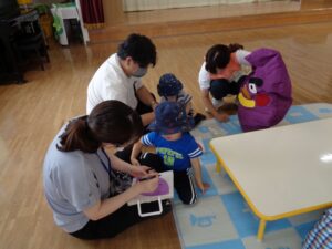 まずは遊戯室でさつまいものペープサートを見たりさつまいもをデザインした袋作りをしました。