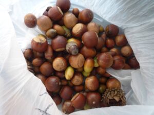 秋の遠足で七北田公園へ行きました。公園のあちらこちらにどんぐりの実がなる木が植わっており、今日はどんぐり拾いをしました。丸いどんぐり、細長いどんぐり、帽子をかぶったどんぐりなど、子どもたちは見つけるたびに歓声を上げていました。拾ったどんぐりは、家に持ち帰ったり制作活動で使ったりします。