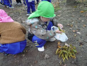 秋の遠足で七北田公園へ行きました。公園のあちらこちらにどんぐりの実がなる木が植わっており、今日はどんぐり拾いをしました。丸いどんぐり、細長いどんぐり、帽子をかぶったどんぐりなど、子どもたちは見つけるたびに歓声を上げていました。拾ったどんぐりは、家に持ち帰ったり制作活動で使ったりします。
