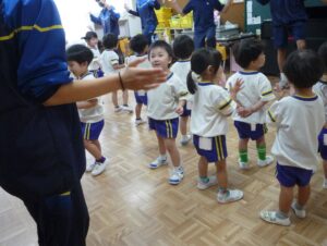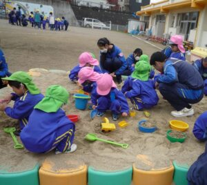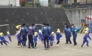 今月、南中山中学校3年生が家庭科の授業「幼稚園実習」でふたばエンゼル幼稚園を5回訪れ、子どもたちと交流しました。中学生が遊びを企画し園児と一緒に遊ぶという交流会です。子どもたちは毎回中学生が来るのを楽しみにしていました。ふたばエンゼル幼稚園では異世代交流の機会が頻繁にあり、子どもたちが地域に親しみ地域の一員だという意識の芽生えにつながっています。