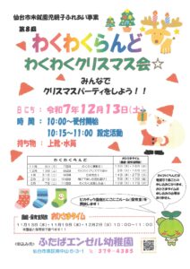 幼稚園の特色 幼稚園の紹介 年間の行事 預かり保育 未就園児教室 メニュー閉じる 幼稚園の特色 幼稚園の紹介 年間の行事 預かり保育 未就園児教室 お知らせ 12月のわくわくらんど イベント2025.11.19 12月のわくわくらんどは わくわくクリスマス会☆ です! サンタクロースがやってきます。サンタクロースと一緒にみんなでクリスマスパーティーを楽しみましょう。 一覧に戻る よくあるご質問 お問い合わせ 【所在地】〒981-3213 仙台市泉区南中山六丁目3-1【TEL】022-379-4385